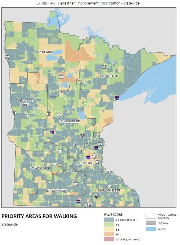 The draft pedestrian plan is extremely promising. It directly identifies the issue that "current MnDOT investments in walking are typically tied to projects that are primarily focused on car and truck traffic,” and that they “primarily focus [only] on meeting ADA standards.” It is clear-eyed that there are challenges for directly funding pedestrian-priority infrastructure, or for exceeding minimum standards for infrastructure when appropriate. To start building the case for more dedicated pedestrian money and projects, the plan presents a “Priority Areas for Walking Study” (PAWS) across the state. To fund improvements to state highways within the highest-priority priority areas, the plan estimates a total cost of $200-600 million, depending on the intensity of the changes.